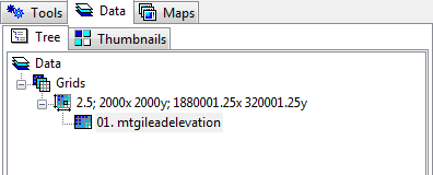This is where SAGA starts to feel really different from other GIS. It organizes your raster data into “Grids” and everything makes more sense once you realize how the grids are named. The first number is the resolution in whatever units your data is projected in (mine is 2.5 feet). The next numbers are how many cells wide and tall your grid is (mine is a square, so the 2000x 2000y makes sense). The next numbers are the starting point of your data. My data is in a foot-based projection of NAD83 for Northern Ohio, so the 7 and 6 digit numbers seem right.