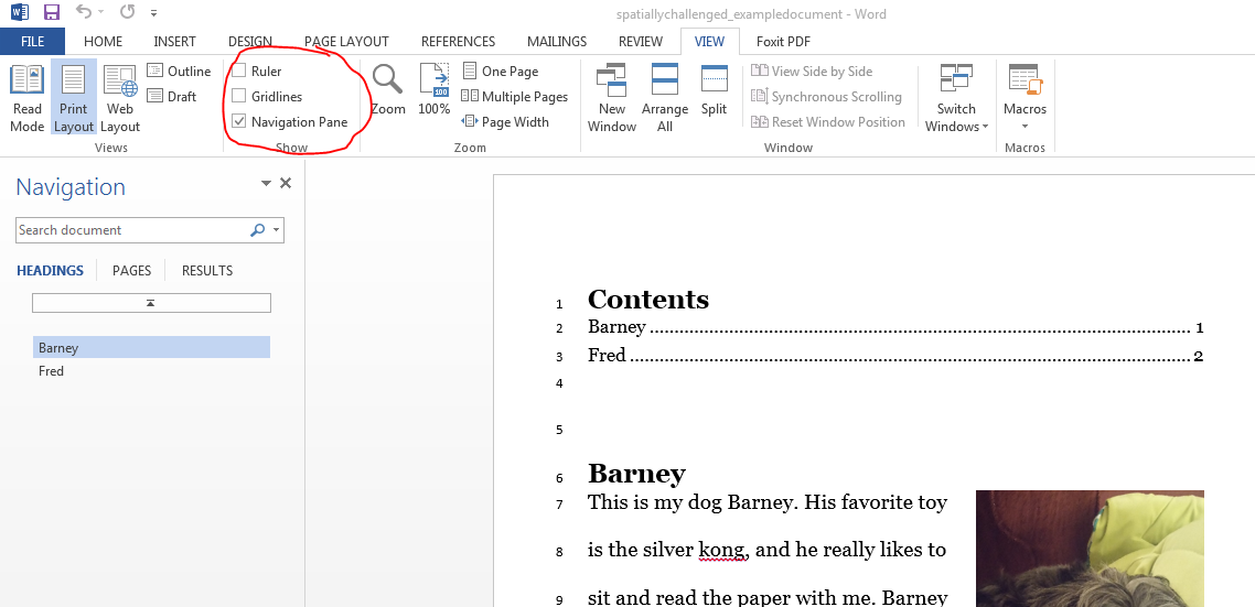 The second thing was the navigation pane. If you use Word’s heading formatting tools, you can go to “View” on the main menu tab and check the box next to “Navigation Pane.” The navigation pane will appear on the left side with your headings. You can click a heading and it will take you right to that page. It’s not super helpful with this short document, but I use it a lot for my thesis. See the picture below for an example of the navigation pane, and sorry for forgetting those last week!