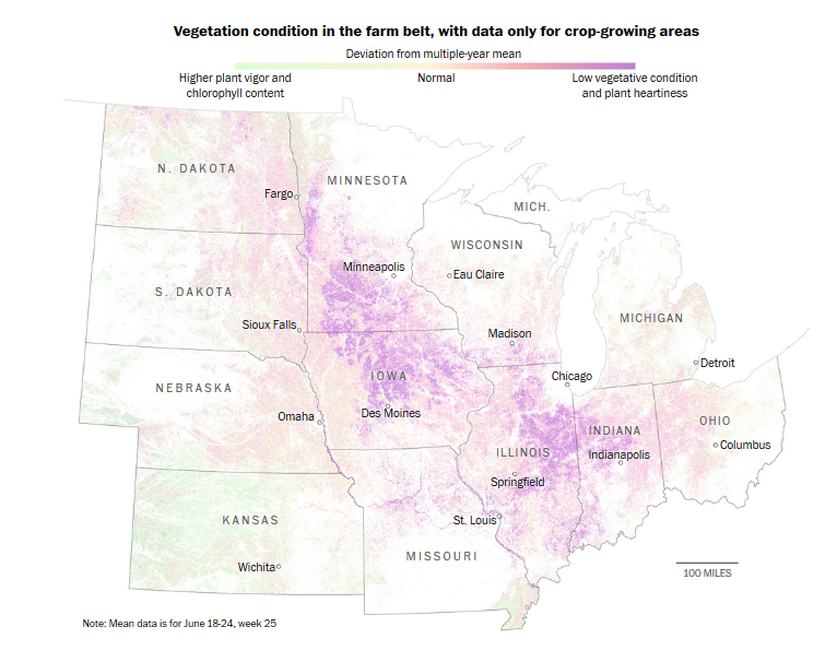 Beyond the fact that it references my MS advisor, this article also has a nice graphic of relative crop health compared to normal. I’m going to ignore the fact that it doesn’t specify the years used in the multiyear mean, and the fact that the chlorophyll content methods are vague and buried in the bottom of the article. It’s a nice neat graphic in a non-academic article that reminded me that not all states suffer under higher-than-average rainfall.