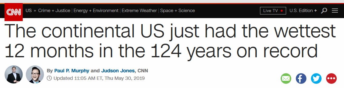 Those of you complaining about the weather may feel validated by this headline from CNN (article here). For the over 1 in 10 Americans work in agriculture and related industries (source), this has real consequences. The increased rain this spring delayed planting, and in some places planting was prevented altogether. The Washington Post has some really stunning satellite photos that show the difference in greenness across the north-central US between 2018 and 2019 (available here— much better on desktop than mobile).