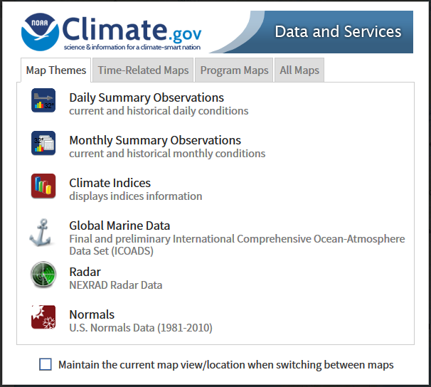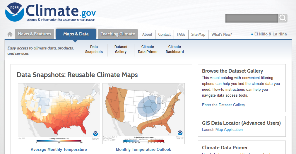 Let’s start with maps! When you go to climate.gov, navigate to the second tab on the main menu– Maps & Data. From this page, there are three features I’d like to point out: Data Snapshots (big center panel), GIS data locator (far right), and Past Data By Zip Code (bottom).