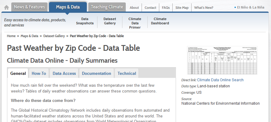 If there’s a specific location you need data for, I recommend using the Past Weather by Zip Code, which is available by navigating through the climate.gov homepage or by going here. Since NOAA provides such a great how-to, I’m not going to go through the step-by-step.