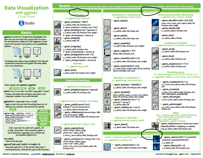 Sometimes instead of knowing what I want the main idea of a chart to be, I know what type of data I have. In those cases, I think about the data type (continuous, categorical, temporal, spatial, etc.) and choose a chart type from there. There’s a good tool for this on the ggplot cheat sheet (see my blog post about it here). It sorts the chart types by number of variables and then further organizes by types of variables (see below– variable numbers are circled in black).