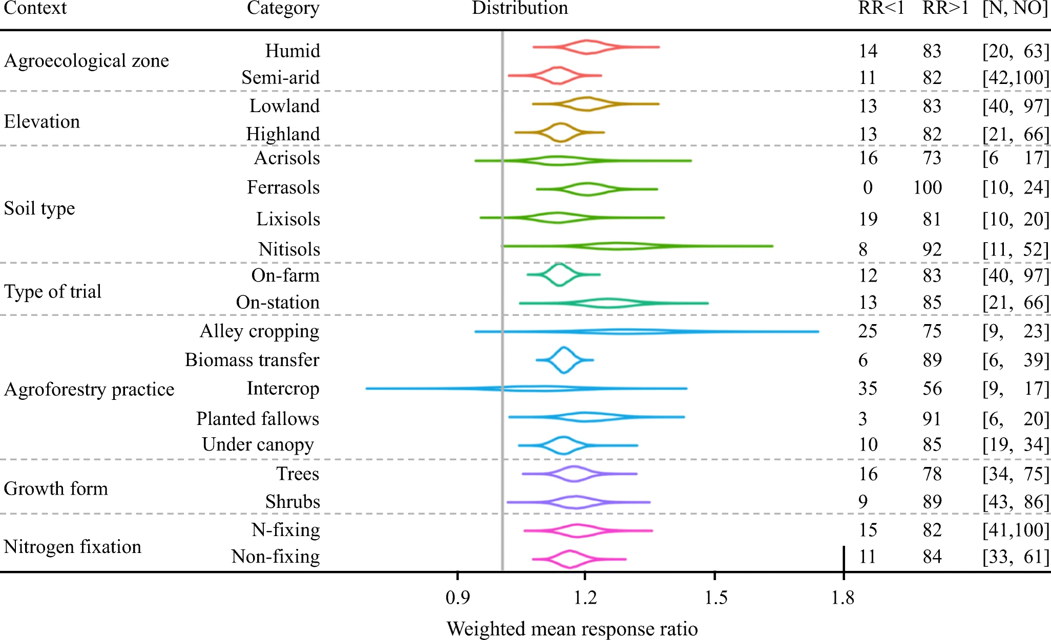 The violin plots from Kuyah et al. are horizontal, showing the lowest values within each “violin” on the left and the highest on the right. You’ll notice that their violins are basically just line drawings or outlines without anything in the middle, and all the violins are symmetrical about their center horizontal axis. These violin outlines can be read like a kernel density plot, which you can read kinda like a histogram.